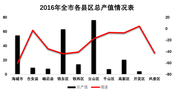 从各县区运行情况看,2016年,开发区呈正增长,全年完成建筑业总产值4.4亿元,增长4.7%,增速居全市之首;台安县完成建筑业总产值9.4亿元,下降2.6%;千山区完成建筑业总产值7.4亿元,下降6.5%;高新区完成建筑业总产值20.4亿元,下降7.2%;立山区完成建筑业总产值76亿元,下降17.3%;岫岩县完成建筑业总产值8亿元,下降35.1%;铁西区完成建筑业总产值14.1亿元,下降40.8%;风景区完成建筑业总产值0.2亿元,下降42.6%;铁东区完成建筑业总产值63.2亿元,下降44.0%;海城市完成建筑业总产值54.4亿元,下降60.6%。